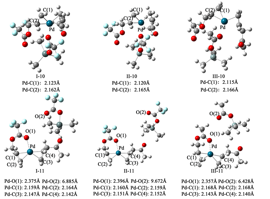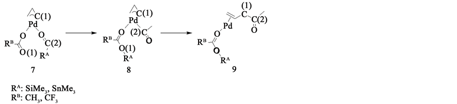 The Sn-C and Sn-O(1) distances of 7 in Reaction I were calculated to be 2.238 and 2.749Å, respectively (see Figure 1). On the other hand, since the Sn-C and Sn-O(1) distances of 8 in Reaction I were 4.900 and 2.073Å, respectively, the Sn-C bond is broken and new Sn-O(1) bond is formed. In reaction (8 → 9), the Pd-C(1) and Pd-C(2) distances of 8 and 9 in Reaction I were 2.072 and 3.963 Å, respectively. As the reaction progresses, we find out that the Pd-C(2) bond have been dissociated. Moreover, 8 in Reaction I was a π-aryl complex, but 9 in Reaction I was not. Reaction II and III showed these results similar to Reaction I.