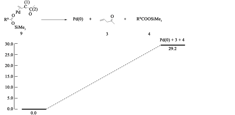 In the proposed reaction mechanism, 9 is dissociated to Pd(0), 3 and 4. Figure 3 displays the free energy change between 9 and three product compounds in Reaction III. Product compounds (Pd(0), 3 and 4) in Reaction III are much more unstable than 9 by 29.2 kcal/mol, it can be considered than this reaction will not proceed. Therefore, we assumed a new reaction shown in Scheme 6.
