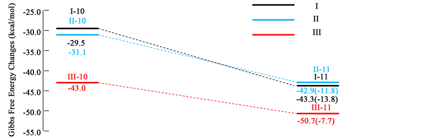 Figure 4. Relative free energies from 10 to 11 in Reaction I, II and III.
