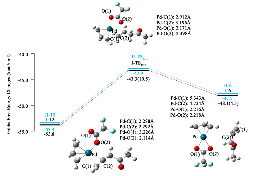 The Pd-C(1) and Pd-C(2) bonds of 9 + 2 in Reaction I were dissociated, respectively. Those distances of 10 in Reaction I were 2.123 and 2.162 Å, respectively, and new Pd-C(1) and Pd-C(2) bonds were formed. The ∆G‡ values of the reaction (9 → 10) for Reaction I was calculated to be 2.0 kcal/mol. Additionally, 10 in Reaction I was more stable by 8.3 kcal/mol than 9. Reaction II and III showed these results similar to Reaction I. In reactiton from 10 to 11, 4 dissociates from 10, and a five coordinated intermediate 11 is generated. The geometry changes and relative free energies of this reaction in Reaction I, II and III are shown in Figure 4 and Figure 5, respectively. In this reaction, new Pd-O(1) bond was formed. This reaction proceeds with no barrier, and 11 was more stable by 13.8 kcal/mol than 10 in Reaction I. From these results, it is considered that reaction proceeds. The succeeding isomerization (10 → 11) occurs, to yield a π-aryl complex 12. The ∆G‡ values of this reaction for Reaction I, II and III were calculated to be 10.4, 10.4 and 13.5 kcal/mol, respectively. Moreover, 12 in Reaction I, II and III were more stable by 10.5, 10.5 and 3.4 kcal/mol than 11, respectively, and this reaction occurs easily.