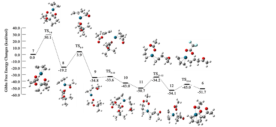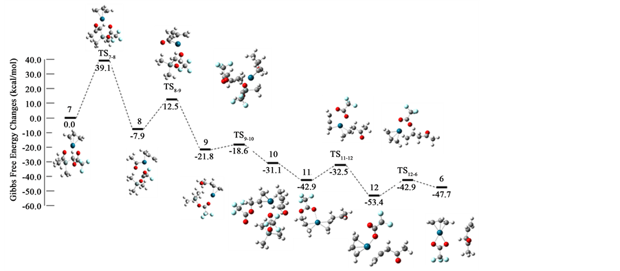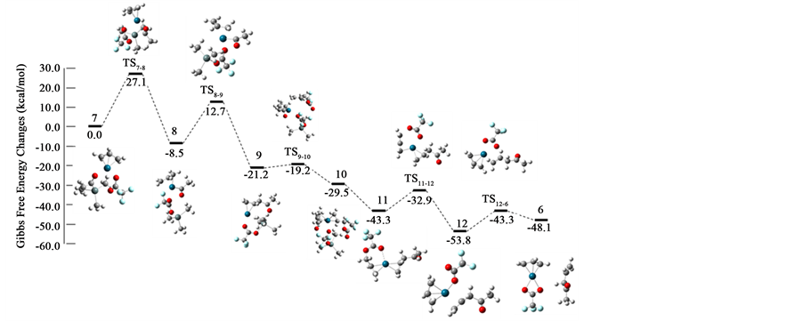 It is considered that the dissociation of 12 gives a product 3 and a mononuclear complex 6. The geometry changes and relative free energies of this reaction in Reaction I, II and III are shown in Figure 6 and Figure 7, respectively. The ∆G‡ values of this reaction for Reaction I, II and III were calculated to be 10.5, 10.5 and 9.1 kcal/mol, respectively. Finally, the reaction between mononuclear complex 6 and 1 are formed an active species 7, and the catalytic cycle is completed.