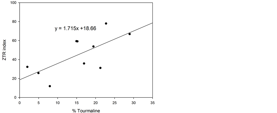 Figure 9. Regression of tourmaline percentage with ZTR index of all samples.