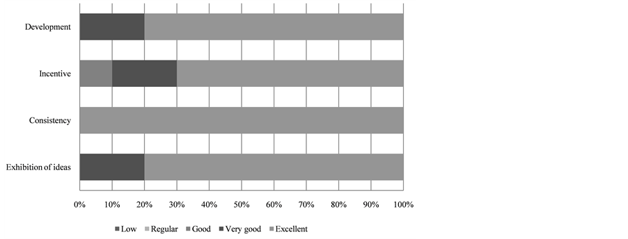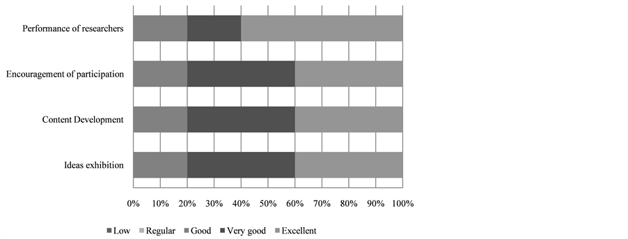 In relation to the researchers, the questionnaire covered the following themes: the performance of researchers in general; encouragement to the participation of the group members; consistency in the development of the content; the form of ideas exposure.