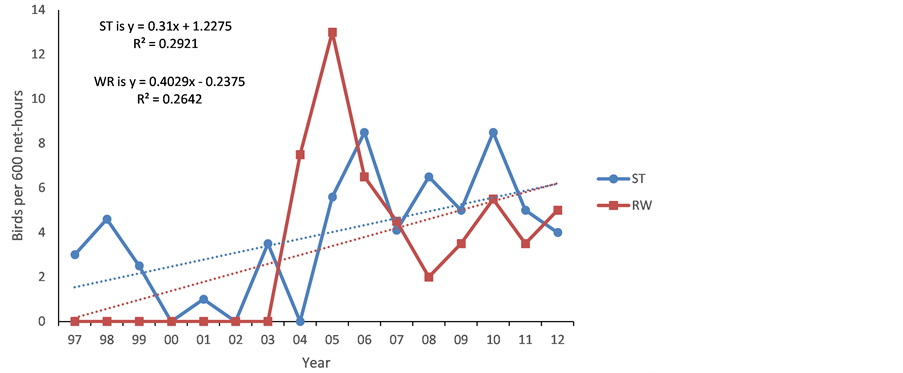 Trends in adult capture rates and RI of 10 target species were estimated with linear regression. A target species was defined as a bird species for which an average of at least 2.0 adult birds per year were captured over the 16 years of sampling (1997-2012 = 32 year-unique captures) and for which we recorded at least two between- year recaptures. The 10 target bird species were Western Wood-Pewee (Contopus sordidulus), Ash-throated Flycatcher (Myiarchus cinerascens), White-breasted Nuthatch (Sitta carolinensis), Rock Wren (Salpinctes obsoletus), Western Bluebird (Sialia mexicana), Virginia’s Warbler (Oreothlypis virginiae), Western Tanager (Piranga ludoviciana), Spotted Towhee (Pipilo maculatus), Chipping Sparrow (Spizella passerine), and House Finch (Haemorhous mexicanus). The significance of the correlation (P-value) for each species was calculated. Because of the consistency of sampling effort in all other years, it was reasonable to use the change in annual numbers of birds per 600 net-hours to determine trends in adult population size.