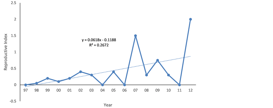 Figure 3. Trend in productivity for Chipping Sparrow near a firing site at the Los Alamos National Laboratory over 16 years (1997-2012).