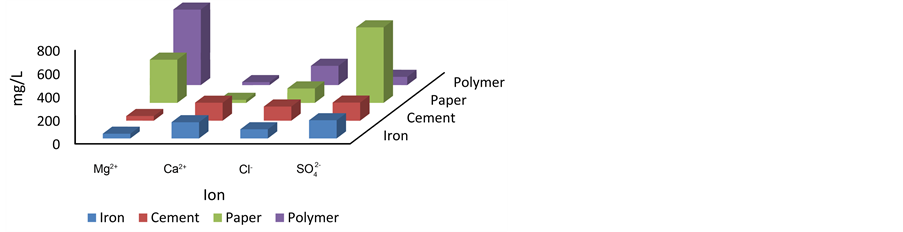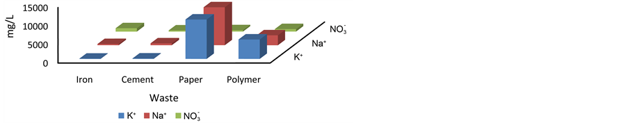 The lowest pH value of the paper waste was found, may be due to acid treatment of the pulp, Figure 3. The lower RP values were marked in the case of iron, cement and polymer wastes, may be due to excessive loading of the oxidizing wastes. However, the comparable values of DO and TH were seen in the all wastes, Figure 3. Remarkably higher concentration of Na+, K+, Mg2+ and