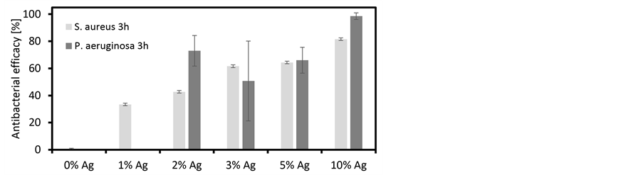 Our Ag: DLC layers were prepared by double PLD deposition using two KrF excimer lasers. Concentration of silver dopant (from zero to 10 at%) was easily regulated by changing of repetition rates of lasers, which ablated silver or carbon from targets. Results of antibacterial testing using Gram-negative Pseudomonas aeruginosa and Gram-positive Staphylococcus aureus bacteria are in Figure 9.