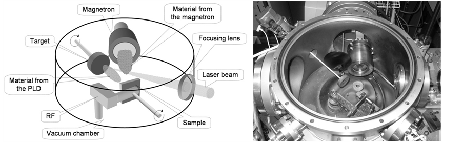Figure 4. Scheme of hybrid PLD―magnetron deposition system (left) and photo of real chamber (right).