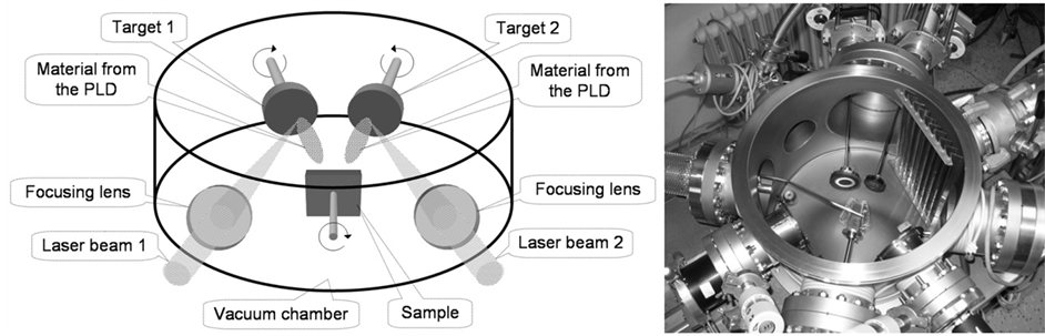 The hybrid deposition techniques are steadily improved to meet the higher technological requirements. Example of hybrid PLD of a new generation is in Figure 8. Chamber enables simultaneously running PLD, double PLD and ion beam, and magnetron deposition.