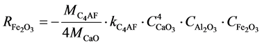 where ω (initial value water/CaO), ξ (initial value kg CaCO3/kg CaO), α (initial value kg C3S/kg CaO), β (quantity kg C2S/kg CaO), Ai (initial value kg Al2O3/kg CaO), Fi (initial value kg Fe2O3/kg CaO), Si (initial value kg SiO2/kg CaO) and C (the initial value of CaO) is.