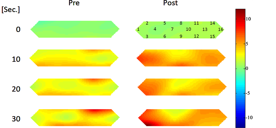 Figure 4. Mean z-score changes in oxygenated hemoglobin (oxy-Hb) measured by near-infrared spectroscopy during the reverse Stroop task. Pseudocolor images plot regional changes in oxy-Hb for pre- and post-intervention during the task. Values on the first row of the first image indicate the channel locations.