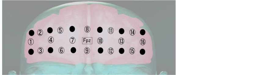 While the participants performed the RST, neural activity in the PFC was recorded by measuring changes in oxygenated hemoglobin (oxy-Hb) using a multichannel near-infrared spectroscopy (NIRS) system (OEG-16; Spectratech Inc., Tokyo, Japan). The tasks, as well as the procedures for the analysis, were in accordance with the protocols of Yasumura et al. [3] . In this system, near-infrared laser diodes with two wavelengths (approximately 770 and 840 nm) were used to emit near-infrared light. The re-emitted light was detected with avalanche photodiodes located 30 mm from the emitters. The temporal resolution of acquisition was 0.65 s. The system measures oxy-Hb at a depth of approximately 30 mm below the scalp. In our system, six emitters and six detectors were placed at alternate points on a 2 × 6 grid, enabling us to detect signals from 16 channels (Figure 1). The center of the probe matrix was placed on Fpz (international 10 - 10 system), and the bottom left and bottom right corners were located around F7 and F8, respectively, following a previous report [3] [29] - [31] . The NIRS signals were sent to a data collection computer. To increase the signal-to-noise ratio, each record was converted to a z-score to compare traces across the participants and channels [32] - [34] . For the analysis, we conducted paired t-tests on the pre- and post-intervention results as behavioral and physiological indices. The level chosen for alpha was 0.05.