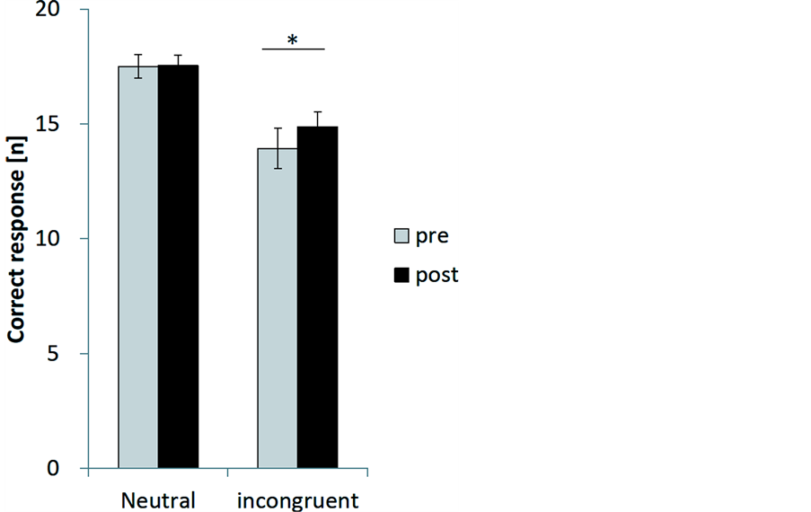 Regarding the RST results, there was no significant difference in the number of correct responses under the non- incongruent (neutral stimuli) condition. However, under the interference (incongruent stimuli) condition, there was significant improvement between pre- and post-intervention (neutral: t(19) = 0.15, p = 0.88; incongruent: t(19) = 2.11, p = 0.049). There was also a significant improvement in interference rate between pre- and post- intervention (t(19) = 2.16, p = 0.044; Figure 2 and Figure 3).