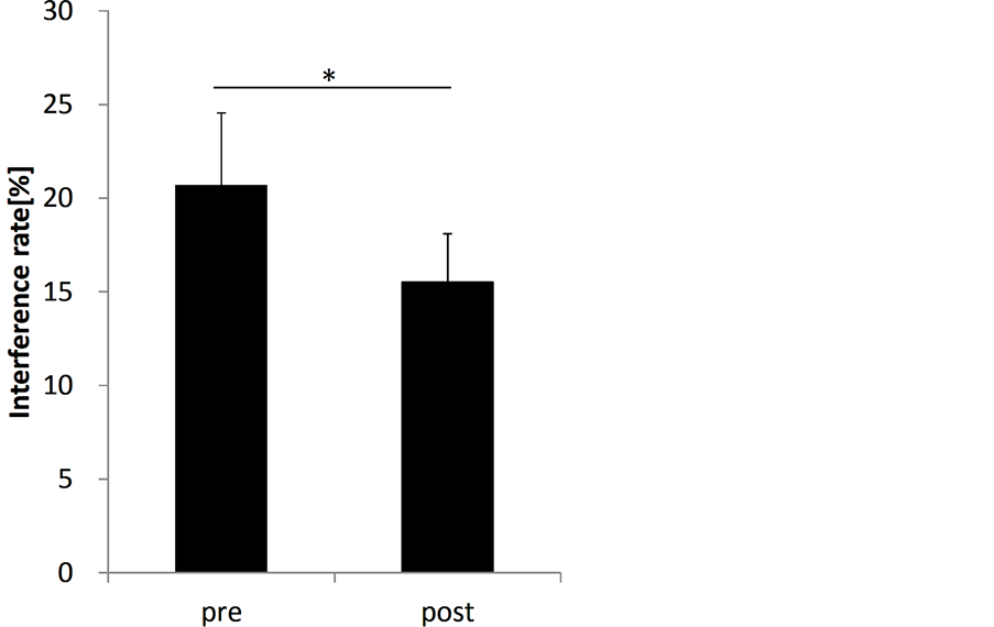 Figure 3. Behavioral results of the reverse-Stroop test. The interference rate for pre- and post-intervention during the task. Error bars indicate standard errors. *p < 0.05.