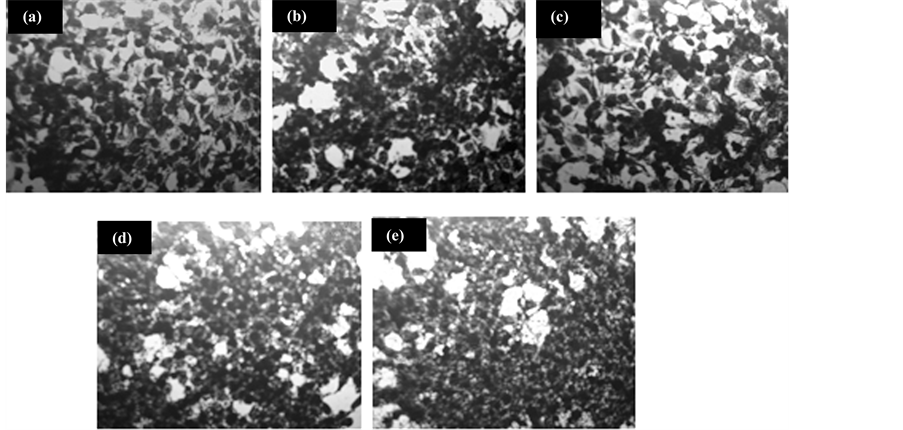 Figure 5. Effect of NM on FA PD220 cell morphology: H&E. (a) Control; (b) NM 50 μg/ml; (c) NM 100 μg/ml; (d) NM 500 μg/ml; (e) NM 1000 μg/ml.
