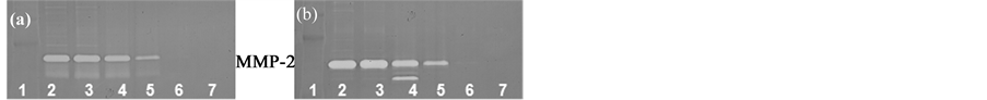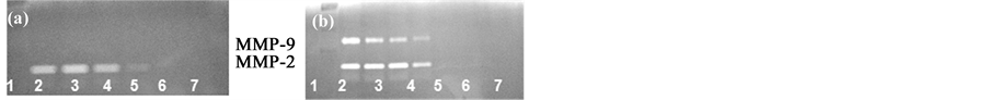 Figure 2. Effect of NM on MMP-2 and -9 secretion by FA PD:20 cells: Gelatinase zymography: (a) NM on FA PD:20 cells; (b) NM on PMA-treated FA PD:20 cells; Legend: 1―Markers, 2―Control, 3 - 7―NM 10, 50, 100, 500, 1000 μg/ml.