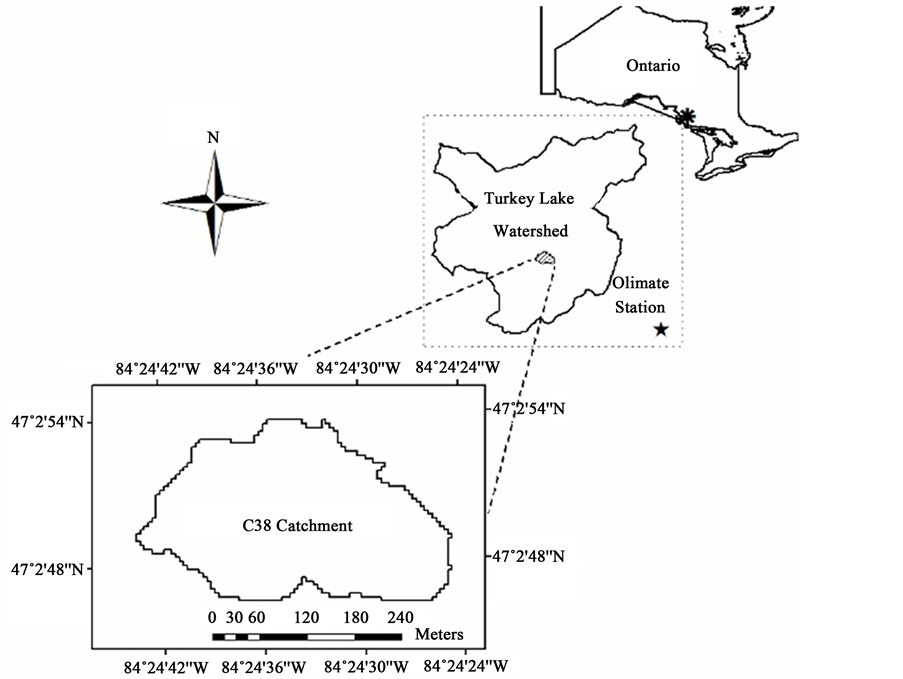 This research was conducted on a subcatchment of the Turkey Lake Watershed (TLW). The TLW has an area of 10.5 km2 and located within sugar maple dominated forest of the Algoma Highlands of Central Ontario (47˚80'30''N, 84˚82'50''W; Figure 3), on the Precambrian shield approximately 60 km north of Sault Ste. Marie [30] . [31] noted that the climate within the TLW is continental and is strongly influenced by the proximity of Lake Superior, with mean annual precipitation and temperature of 1200 mm and 5.0˚C respectively, for the period 1981 to 2006. A snow pack typically persists from late-November, early December through to late-March, early April. Peak stream discharge occurs during snowmelt and again in October to November during autumn storms. Almost 35% of the average precipitation is in the form of snowfall and spring snowmelt accounts for 30% - 60% of annual runoff [32] .