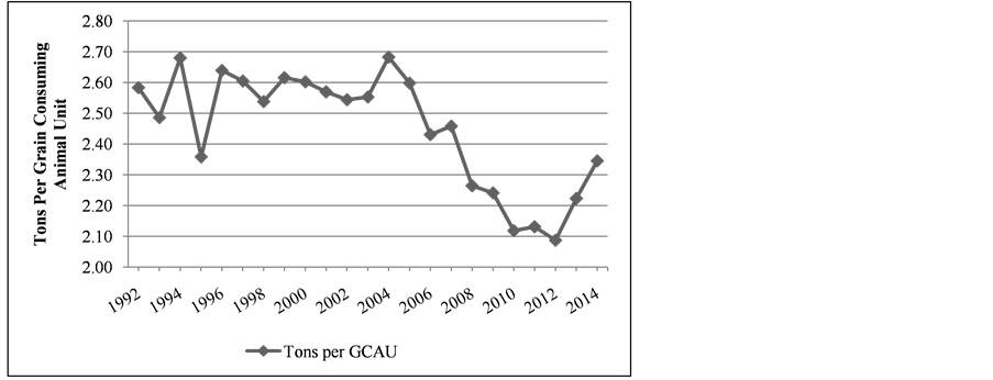 Figure 1. Tons of feed consumed per grain consuming animal unit (nationally), 1992-2014 [19] .