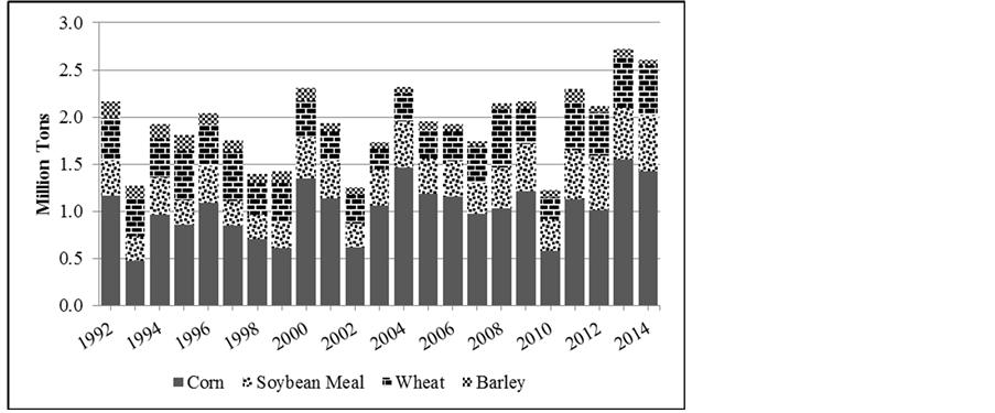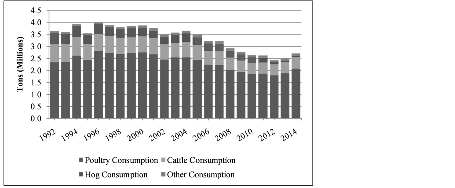 A number of studies have examined grain consumption or feed requirements using different estimation methods and geographical scopes (e.g. national or state). Meilke [4] , for example, proposed a six-equation simultaneous model (incorporating feed, food and industrial use, exports, previous stocks, and animal units) to calculate and predict levels of feed demand at national level in the United States. More recently, Dikshit and Birthal [5] use animal population numbers and amount fed per animal-type to estimate grain consumption in India. Others studies have used similar procedures as Dikshit and Birthalb [5] , but applied the methodology to sub-national regions. For instance, Lammers, Hart, and Honeyman [6] used animal population numbers and corn used per type of livestock to calculate corn consumption in Iowa in 2010. This approach, however, is not wholly representative of grain consumption since corn is just one of the major row crops fed to livestock [7] . Others also invoke the approach of aggregating various types of rations fed to livestock. Huffman and Kenyon [8] developed estimates of consumption for Virginia using animal population quantities and the amount fed per animal-type to calculate corn and soybean consumption from 1965 to 1997. While that study is limited by a narrower portfolio of feed grains considered, it offers additional insight by taking the analysis beyond the state to the agricultural district level.2 In another study, Tiffany and Fruin [9] examined grain (corn, oats, soybean meal) consumption and distribution patterns at the county-level in Minnesota in 1999 using similar procedures to Huffman and Kenyon.