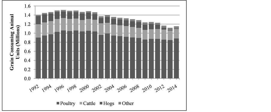 Poultry accounts for the largest share of Virginia livestock production with 287.8 million units (number of head) out of a total of 289.7 million animals in 2014.15 However, the conversion of livestock populations into comparable units based on feed consumption changes the relative weight of different animal populations. For instance, grain consuming animal units appropriately increase the weight of cattle while lessening that of poultry. This is important because the grain consuming animal units show the overall trends in grain consumption that are due to changes in the different animal populations.16 According to Prater and O’Neil [13] , Virginia was ranked 22nd in the United States in the average number of grain consuming animal units from 2006 to 2010.17 Overall, however, the number of grain consuming animal units has generally declined over the period of 1992 to 2014, as shown in Figure 3. This downward trend is mainly due to generally declining populations of broilers, turkeys, layers, hogs, and dairy cows.18 The reduction in the number of hogs raised in Virginia is particularly notable from 2010 to 2014.19