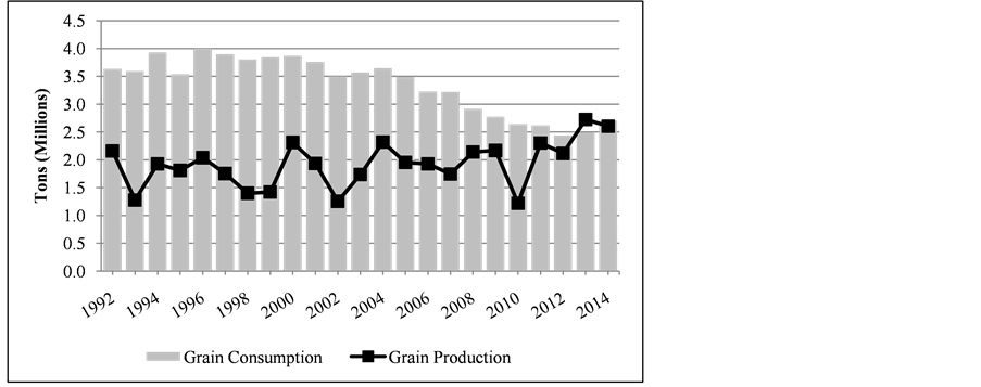 Figure 2. Grain production in Virginia, 1992-2014 (million tons) [15] .