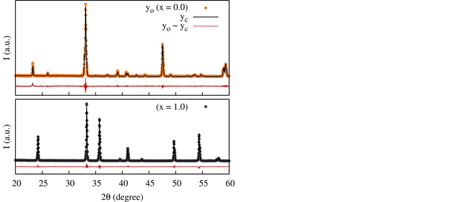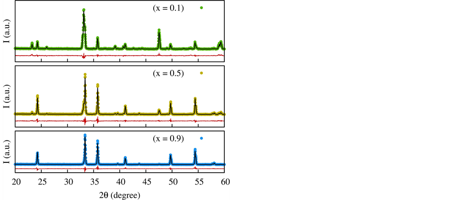 The XRPD observed (yo) and calculated (yc) profiles of CTO (x = 0.0) and CRFO (x = 1.0) are shown in Figure 1(a). The XRPD polycrystalline patterns for the composite members (x = 0.1, 0.5, 0.9 mol%) of the series are shown in Figure 1(b). The red lines (positioned bellow diffractograms) represent the relative difference between the experimentally observed and the computed intensities by the refinement method. According to the XRD results, there are well defined two-phased ceramic composites combining CaTiO3 (perovskite structure) and a Cr3/ 4Fe5/4O3 (hematite structure), both indexed in the Inorganic Crystal Structure Database (ICSD) [18] under the codes 163,528 and 163,943, respectively. The Rietveld refinement of CTO was carried out based on a reference model [19] . The CTO present, at room temperature, orthorhombic structure belonging to the spatial group ( 62), with four molecules per unity cell (Z = 4). In this structure, the calcium is localized in the Wyckoff position 4c, where the oxygen ions occupies the sites 4c and 8d and titanium occupies the site 4b. A crystallographic model based on iron oxide and on chromium oxide was proposed [7] to study the CRFO phase. It was suggested that CRFO presents (at room temperature) a trigonal structure belonging to