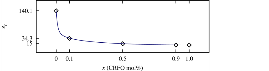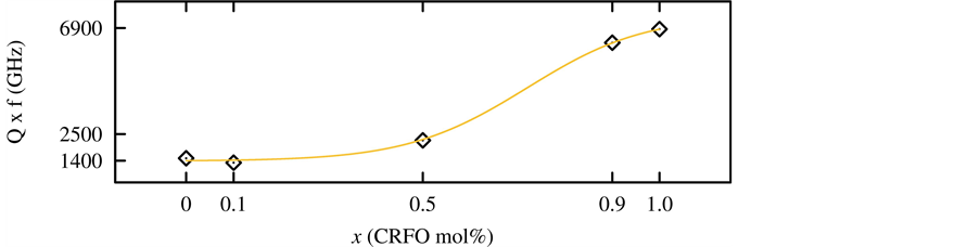 methodology described in the literature [13] - [15] . All materials resonated in the range from 2 GHz to 7.94 GHz. The CTO (x = 0.0) and CRFO (x = 1.0) base compounds limited the εr of the series: 140.1 and 8.3, respectively. The decrease in relative dielectric permittivity values accompanies the resonant frequency raising. The dielectric loss (tan(δ)) for the materials is around 1 × 10−3. The behavior of the quality factor is not explained considering only the proportion of CTO/CRFO present in each composite, as seen in the case for (x = 0.1), with the lower result. It seems that additions of CRFO improved this parameter along the system: the Qu × fr increases from 1499 GHz (x = 0.0) to 6853 GHz (x = 1.0). Alteration in the production route, and hence in the resulting microstructure, can be an indicative of the differences observed for literature reports of the same material, presently exemplified by CaTiO3. The temperature coefficient of resonant frequency values verified ranges from high positive (+921 ppm∙˚C−1 for x = 0.0) to moderately negative (−56 ppm∙˚C−1 for x = 1.0). In detriment of other characteristics, relatively better combination of microwave dielectric properties was reached for (x = 0.9) member: Quxfr = 6291 GH, a relatively good factor [23] , and τf = −47 ppm∙˚C−1. The potentiality of these composites would be significantly increased by further improving the quality factor values.