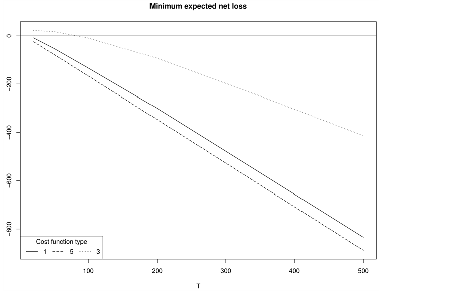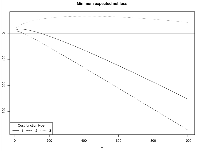 As the operational time T increased we saw a decrease in the minimum expected net loss in the modified full model for all three cost functions (as seen in Figure 8). This is in contrast to the results with the simplified model when the exponential cost functions were used. Then, the minimum expected net loss increased at first, before it started to decrease (as seen in Figure 3).