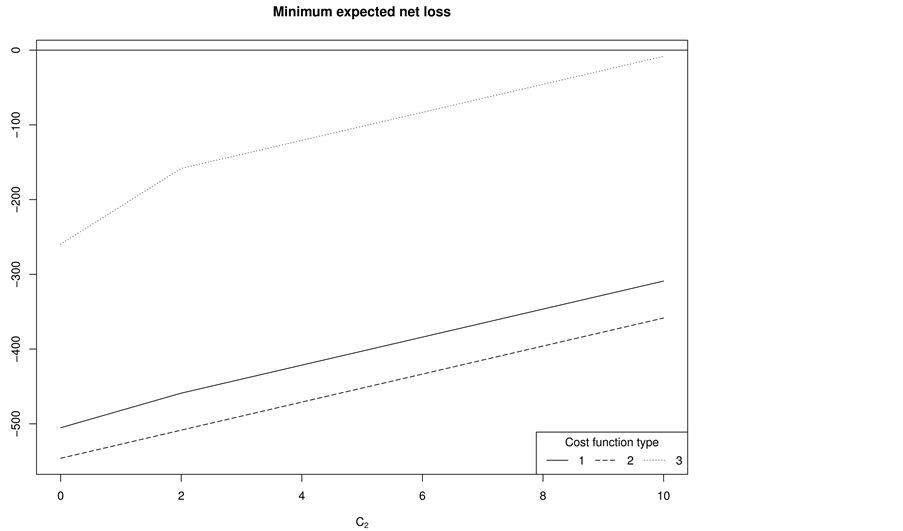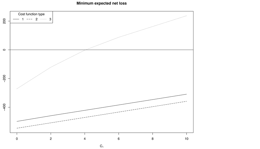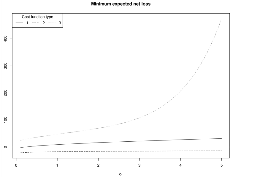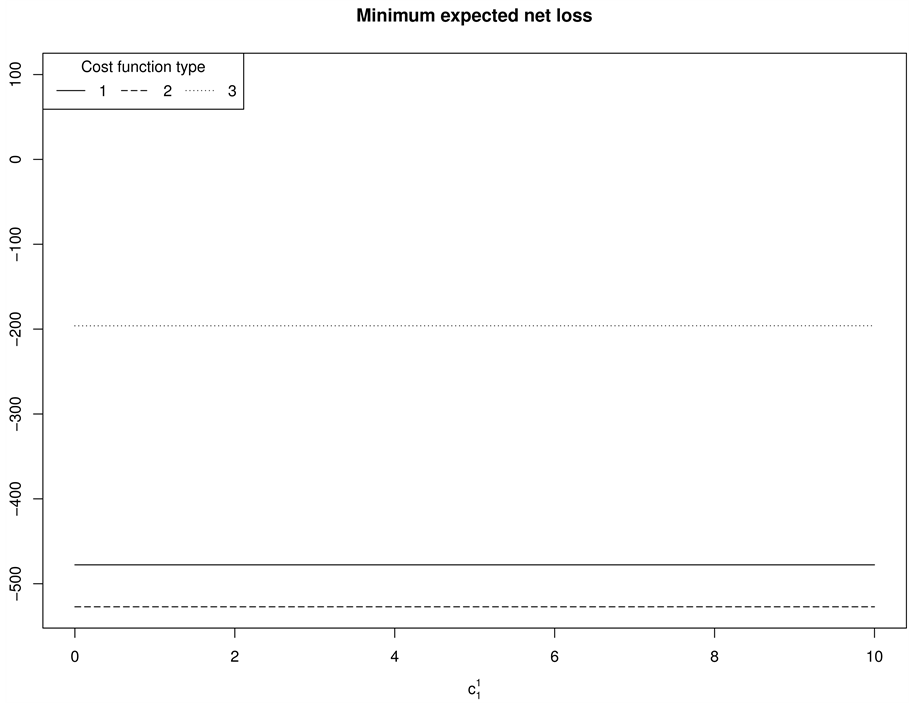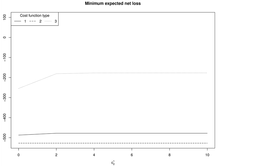 for component 1 increases, the minimum expected net loss also increases for cost functions of type 1 and 3. The minimum expected net loss remains unchanged when cost functions of type 2 are used. See Figure 14 and Figure 15. An increase in