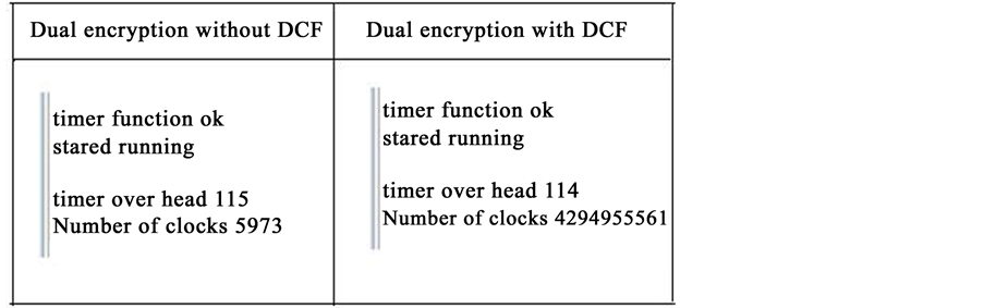 Nios II processor displays the time consumed when the FPGA based dual encryption is implemented with or without DCF. It is clear that when the second dimension time is incorporated, the time taken for cryptanalysis is increased. Also, the delay is made compulsory using the DCF. The displayed results of Nios II based Analyzer are shown below in Figure 7.