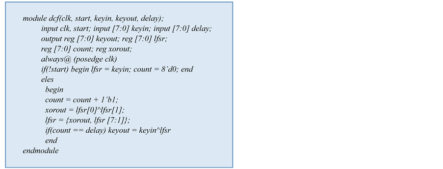 In case of FPGA based delay generation for temporal validation, a simple key rotation is used. That is for generating 10 units of delay, the key is rotated by 10 bits, one bit per clock so that after 10 clock cycles time consumed is 40 seconds and the original key is rotated by 10 times either clockwise or anticlockwise. However, in actual implementation, the ten-bit rotation can be done in a single clock cycle so that the time dependency is not compelled. Hence, a delay compulsion function is introduced. Figure 1 is the Verilog code for DCF that is used for this implementation.