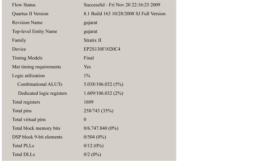 The proposed scheme is implemented on an Altera Stratix II (EP2S130F1020C4) device as shown in the compilation summary in Figure 4.