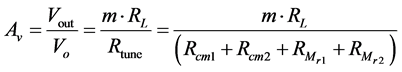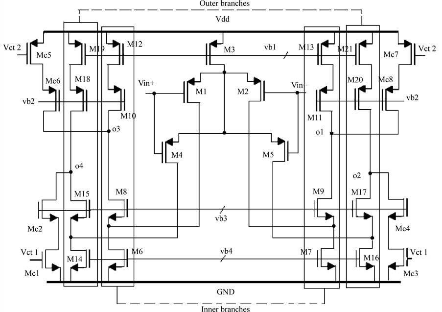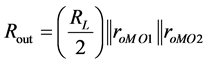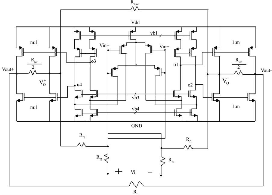 . Indeed this parameter (m) is the current mirroring ratio of the output stage devices. There is a trade off in the designing the parameter m. Larger m causes the larger parasitic capacitor in the output nodes of the first stage (o1, o2, 03, o4), and reduces the speed of the feedback loop and linearity in the higher frequencies. In the opposite side, larger m reduces the power consumption of the first stage by reducing the bias currents of the feedback loop devices. Considering this trade off, the optimum size can be found which gives good open-loop and closed-loop linearity and reasonable power consumption, by trial and error approach and considering the simulation results. According to this method, m is designed to be 30. The sizes of output stage devices are shown in Table 1. To calculate the voltage gain from