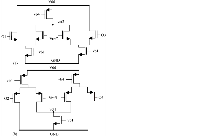 Figure 6. Common-mode feedback circuit of the first stage (a) Common-mode feedback circuit for branch with higher common-mode voltage level. (b) Common-mode feedback circuit for branch with lower common-mode voltage level.