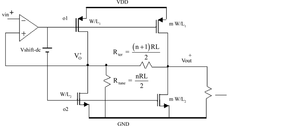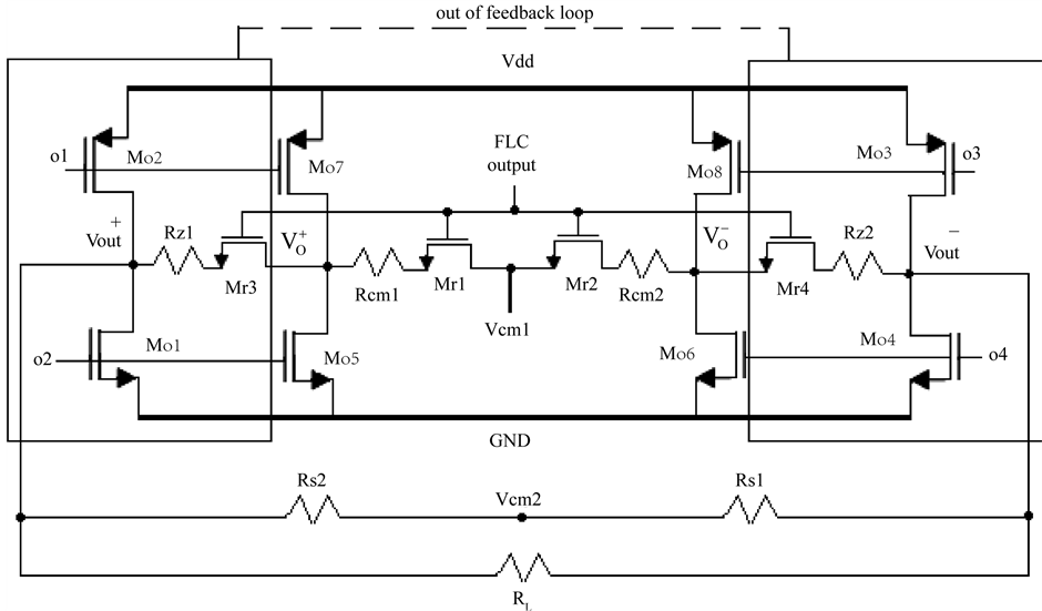 Devices Mo1-Mo8 form the well known class A/B output stages in the differential mode. Notice that devices Mo1-Mo4 are out of the resistive feedback loop (Figure 2). Indeed the devices Mo1-Mo4 are used to tune output impedance of the line diver and force it to be equal with RL. By tuning the output impedance of the LD the cable impedance variations can be compensated and the reflections will be removed from the line. Mr1-Mr4 devices are in the triode region, and form the tunable resistors. The gate voltage of these devices will be tuned with a FLC to correct the output impedance and gain of the LD. Impedance matching is done using a topology wherein, when the output voltage(Vout) is equal to the input, the output resistance is matched to the line [1] [8] . This scheme has the advantage that it can adjust to external line as well as internal process variations. The dc-gain of the output stage can be calculated as: