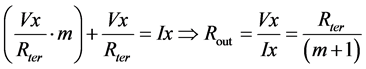 From Figure 7 and Figure 8 the output impedance of the LD is achievable. To calculate the output impedance of the LD, test voltage (Vx) is applied to the output node (Vout) and the current produced is calculated. With writing a KCL in the output node (Equation (6)), and calculating Ix (current of Vx), the output impedance