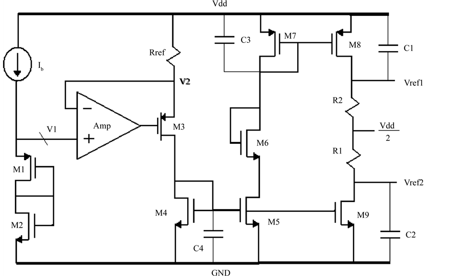 Figure 10. Reference voltages (Vref1, Vref2) generator circuit for input stage common-mode feedback circuit.