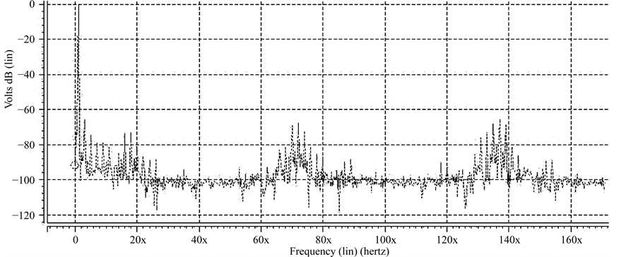 output waveform of the LD. The LD drives a 75 ohms resistive load and 10 pF single-ended capacitors which include pad capacitors. The closed-loop and open-loop frequency response of the LD while driving a 75 Ω and 10 pF output capacitors are shown in Figure 15 and Figure 16 respectively. Output spectrum (FFT analysis) for the same test is shown in Figure 17. It shows about −67 dB THD. To simulate the effect of the power supply noise in the LD and evaluate the performance of the circuit of Figure 10 in compensating the power supply noise, some sinusoidal voltage sources with different frequencies are added in series with the Vdd. Figure 18 shows the efficiency of the employed technique in the improving the PSRR. In fact the negative effect of the power supply noise in the THD of LD is reduced to a great extent by using this circuit. Table 3 summarizes the THD of the LD in the different RL and different frequencies in 3.2 Vp-p output voltage swings. Table 4 summarizes the THD of the LD in the different output voltage swings. Table 5 summarizes the main features of this design and compares it with some recent works. It shows that bandwidth, power consumption and especially THD performance, are considerably improved compared to the other designs. To show the performance of the FLC, error (e) and change of error (Δe) signals are applied to the FLC. Also a differential 90 Ω load is connected to the output nodes of the LD. As shown in Figure 18 termination (e ≈ 0) has been done by FLC in about 28 usec. After 110 usec the load resistor (RL) is changed to 75 Ω. In this case the impedance termination has been done in about 15 usec. The simulation result of the impedance termination is shown in Figure 19.