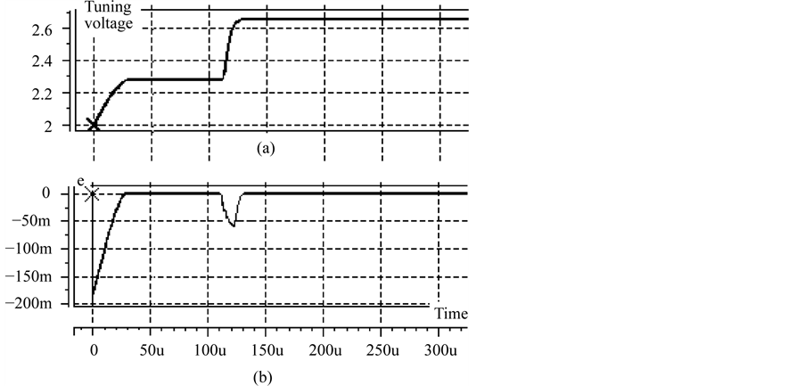 Figure 19. Simulation result of the structure for cable impedance variations (90 to 75 ohm). (a) Output of FLC (b) Error voltage (e).