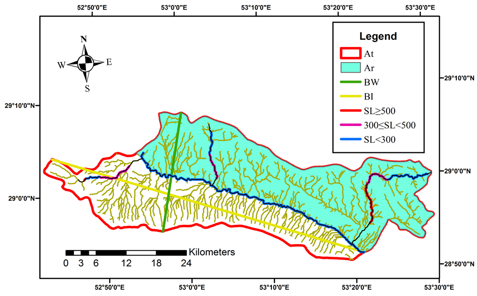 Theses parameters are measured by topographic maps and digital elevation model (DEM). The values of SL index were classified into three categories: 1 (SL ≥ 500), 2 (300 ≤ SL < 500) and 3 (SL < 300) [13] .