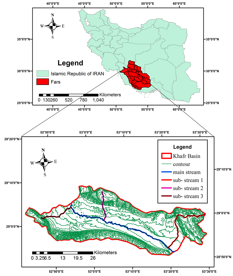 Khafr basin geographically is located is located on 52˚42'43" to 53˚30'3" longitudinal east and 28˚5'56" to 29˚8'20" northern latitude. Khafr basin in Jahrom city, Iran, is about 1182.5 square kilometers and one of the most populous and important part of Jahrom city. The maximum height of the basin is 3163 meters, its minimum height is 1165 meters, and its average height is 1735 meters. The main hydrographic network and the only major flows within the Ghareaghaj River is approximately 59 km (Figure 1).