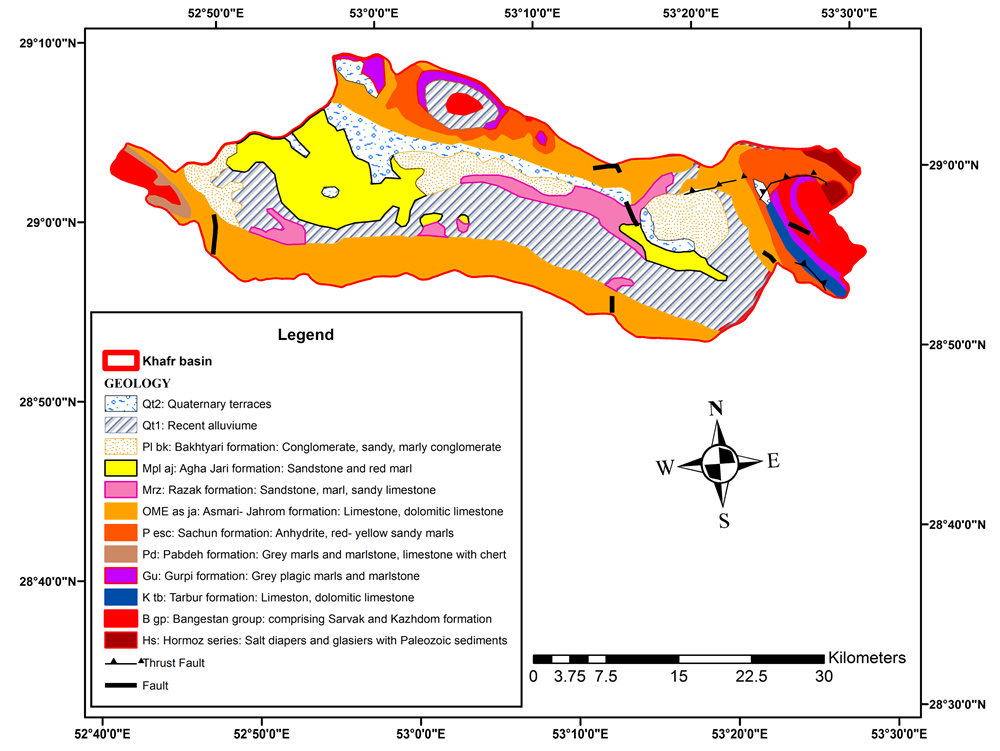 Investigation of geological map of 1:250,000 Shiraz and Jahrom showed that the case area is consisted of several formations that are different in terms of resistance, these formations include: Bangestan (Bgp) is often of limestone, crack systems and karst phenomena usually are developed in them. Tarbur (Ktb): This formation is related to Upper Cretaceous, mainly is composed of massive reef limestone and its color is cream-colored, Gurpi (Gu): In the cutting of this formation is seen 320 m gray-blue marl and shale and secondarily layers of clay limestone, this formation has little resistance against erosion and has created the gentle topography. Pabdeh (Pd) This formation is related to Eocene and consists of clay sediment in terms of lithology. Sachun) Pesc( Mainly includes white to gray gypsum, yellow dolomites, silty lime stones and red marl. The upper part of this formation is composed of massive and marly gypsum with dolomite. Asmari Jahrom (OME as ja): Jahrom formation mainly composed of fossiliferous limestones with good layering and sometimes with layers of marly limestone, Asmari formation is mainly consists of cream to brown resistant limestone with shale layers. Age of this formation is considered Oligocene to lower Miocene. Razak (Mrz) is related to lower Miocene and is composed of red, green and gray Marly rocks, in some cases gypsum can be found. Aghajari (Mpl aj) Limestone it begins with brown to gray sandstone layers and a thickness of 2 to 5 meter , and continues with a thick layer of red marl and thin layers of sandstone and silt, sandstones of this formation are usually highlight mode but marl and silt have been deep erosion. Bakhtiari (Pl bk): age of Bakhtiari formation is the late Pliocene to early Pleistocene that is composed of conglomerate and sandy marly conglomerate and current alluvium. Sediments of Quaternary exist on the surface and different heights of each type of rock from any era and created several low steep lands which are separated by rough stone heights and formed big and small fields. Most residential and agricultural areas of Khafr are built on current alluvium which encompasses approximately 372.5 km2 that is 32% of Khafr section (Figure 2).