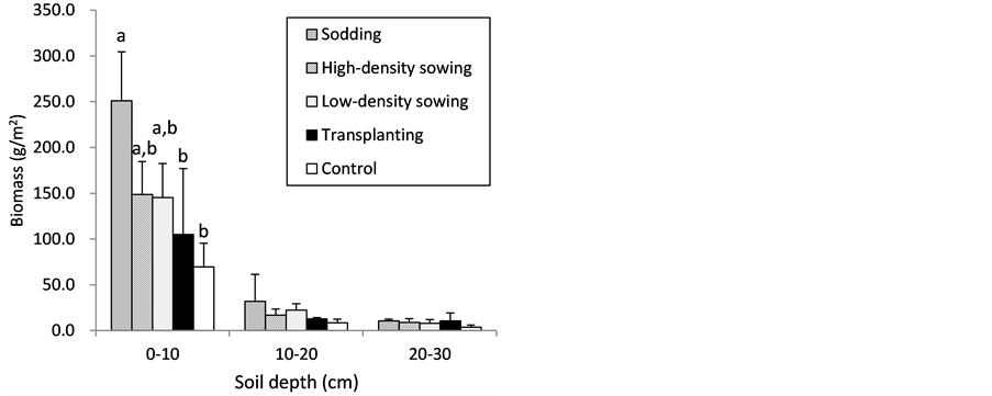 To assess belowground biomass, soil was sampled to a depth of 30 cm using an auger with a 4-cm diameter on11 April 2013. In each plot, the center and four points equidistant from the center and each edge were sampled. Each soil sample was separated into 0 - 10, 10 - 20, and 20 - 30 cm portions, and the upper, middle, and lower portions from the five sampling points within each plot were each combined. Live plant parts were removed from each soil sample, dried for 3 days at 80˚C, and weighed.