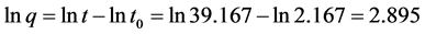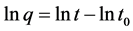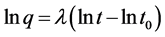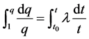 式中q为宇宙万物(包括人类)的规模(大小)和质量(品质),t为时间,λ为系数。由于对任何事物都可以仅用质量(品质)和规模(大小)两个参数加以描述,所以,如果设某种事物诞生时的质量(品质)或规模(大小)为1,孕育时间为t0,那么,对(1)式积分,有: