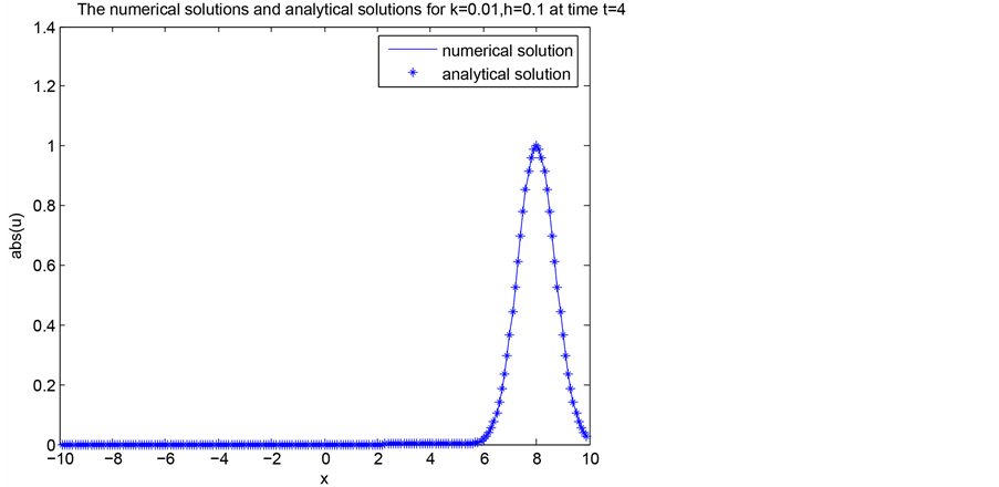 Figure 4.The numerical solutions and analytical solutions for k = 0.01, h = 0.1 at time t = 4.