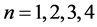 Figure 2. The numerical solution at various times t = 1, 2, 3, 4 with