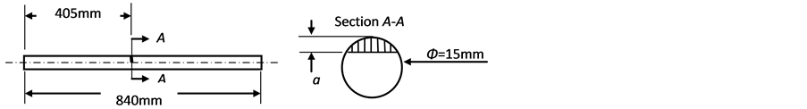 Six shafts made of commercial steel AISI 1020 are used in the bump tests [18] . The basic dimensions of all shafts are shown in Figure 1. The shaft mass is 1.160 kg. The depth of the transversal crack is indicated by symbol a.