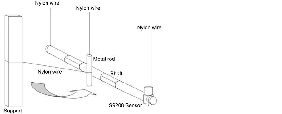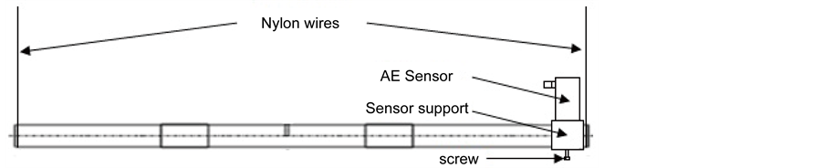 Each shaft undergoes five bump tests, which provide 30 AE signal samples for analysis. The bump is provided by a steel bar, which also is hanged from the ceiling using a 0.8 mm diameter nylon rope, as it is depicted in Figure 3. A small pendular motion is induced in the testing shaft when the bar hits the shaft. The impact takes place always at the same position for all shafts. To avoid large variation on the impulse caused by the bump, the hitting metallic bar is connected by means of a fixed length nylon rope to a concrete column.