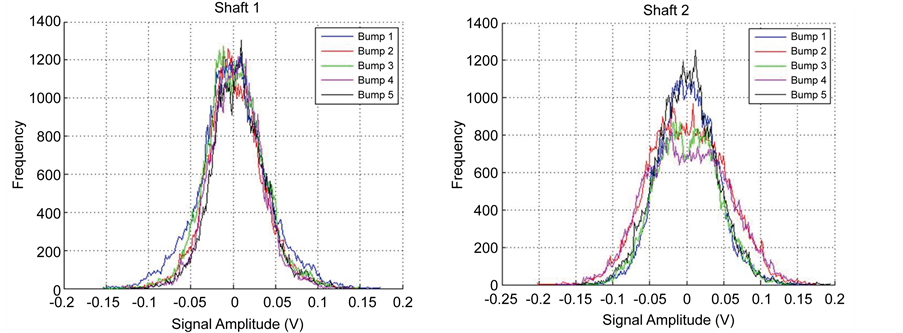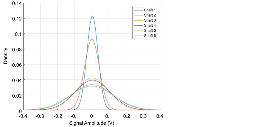 The mean value and the standard deviation from Table 2 can be used to adjust an equivalent normal distribution on the AE amplitude distribution for each shaft. The curves of AE amplitude probability distribution for each shaft are depicted in Figure 6.