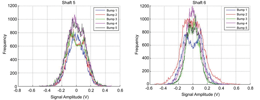 The curves of AE amplitude distribution versus frequency for the 30 bump tests are shown in Figure 5. Curves 5.a, 5.b, 5.c, 5.d, 5.e, and 5.f depict the five curves of AE amplitude probability distribution, respectively, for shafts 1, 2, 3, 4, 5, and 6. It can be noticed that there is a spreading trend on the base of the distribution as the shaft crack increases.